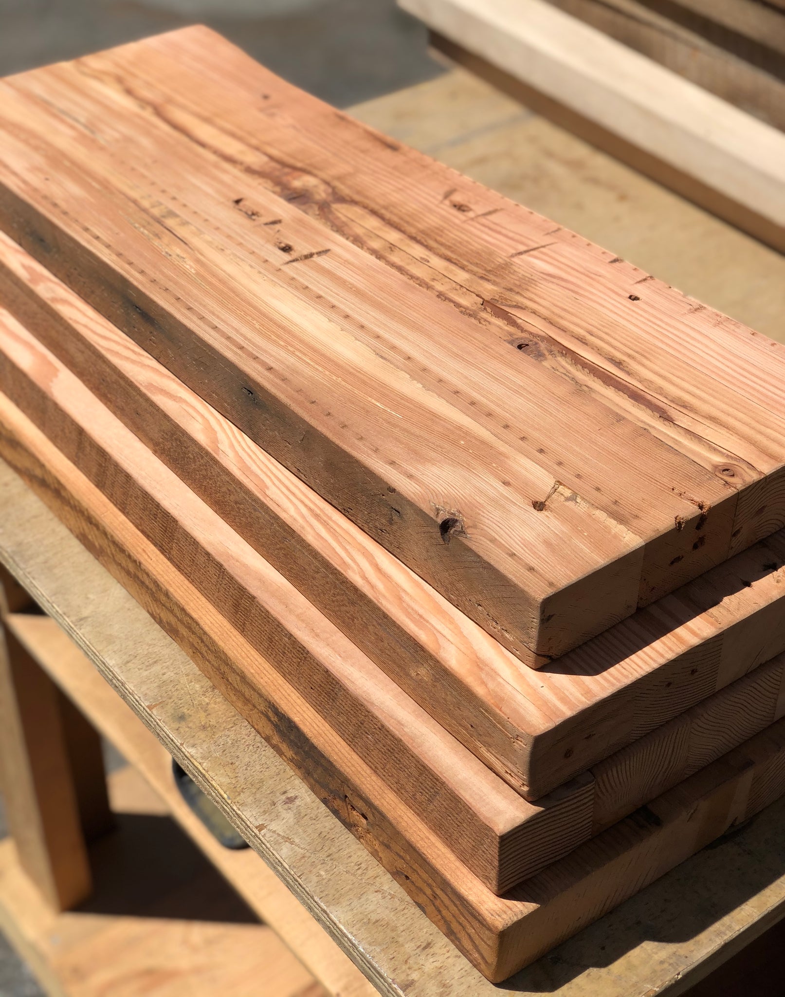Surface: Our shelves have a smooth patina on the top and bottom with a lightly sanded original mill sawn front edge to preserve character.